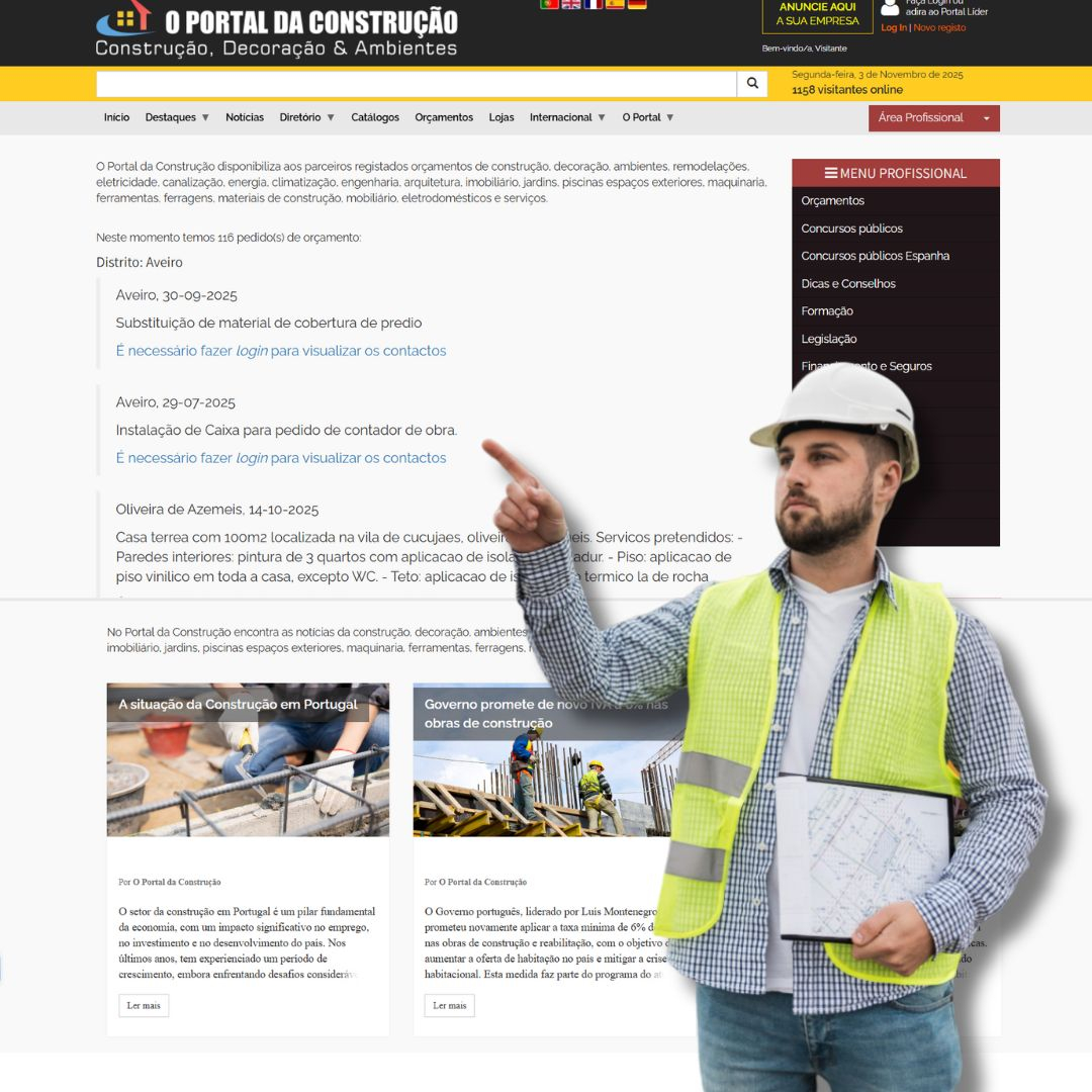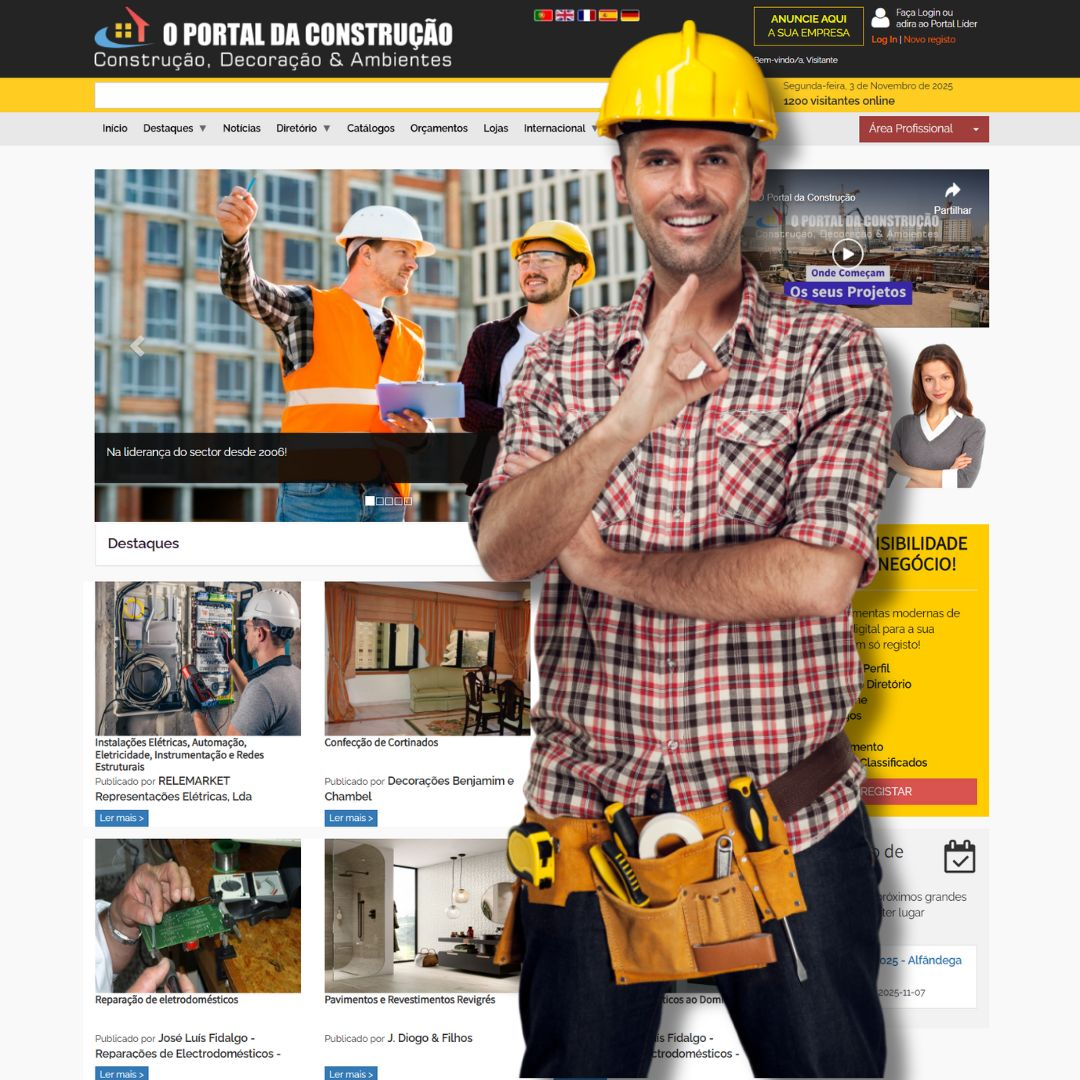 O Portal da Construção e Ambientes (online desde 2006) é a ferramenta de trabalho diária para milhares de profissionais. Com o plano COMPLETO, a sua empresa não apenas aparece — ela domina. Garanta destaque máximo, ferramentas de prospeção de negócio e uma apresentação institucional de excelência.